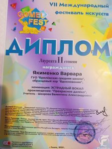 Ученица 4 «Б» класса Якименко Варвара приняла участие в VII Международном фестивале искусств GOMELFEST и получила диплом лауреата II степени в номинации «Эстрадный вокал». Поздраляем Варю и её учителя Шахрову Валентину Александровну и желаем дальнейших успехов! Мы вами гордимся!