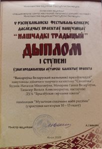Поздравляем коллектив наших учителей и учащихся, которые получили диплом 1 степени на заключительном этапе этого конкурса, показав высочайшее исполнительское мастерство и волю к победе. К такому высокому результату наш коллектив привели Грабченкова Александра Александровна, Топаллер Ольга Александровна, Будник Наталья Николаевна, Мохорева Анна Валерьевна, Скоропацкая Ирина Викторовна и Клевко Светлана Васильевна.